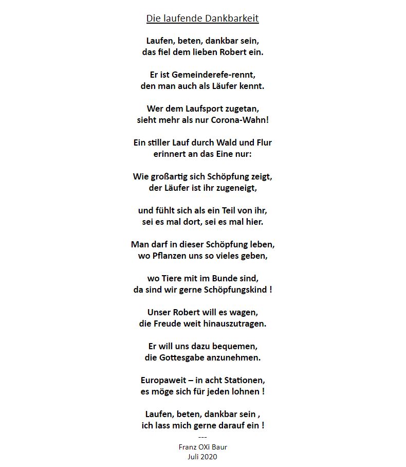 Hallo liebe Freunde aus Ochsenhausen und Umgebung. Auch ich schließe mich gerne an die super Idee an "Lauf und Gebet für Europa". Jeden Tag laufe ich so 4 km und danke Gott für so Vieles was ich jeden Tag aus seiner Vaterhand bekomme... gestern waren wir sogar auf dem Kreuzberg ( 2 Stunden nur steil bergauf ) mit dem Anliegen, Gott segne unser Europa! Liebe Grüße aus dem wunderschönen Medjugorje!
